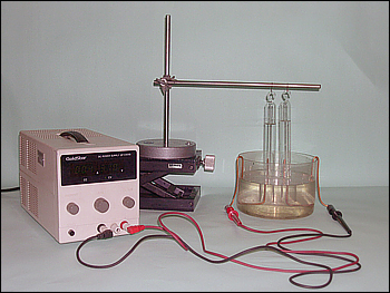 - Introduza os eletrodos de grafite dentro do béquer de 250 mL, tomando o cuidado para não deixar os eletrodos de grafite se tocarem.