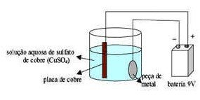 Para dar o banho de cobre, é necessário dissolver sulfato de cobre em água no recipiente de vidro.