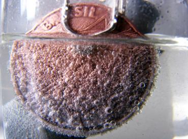 Para avaliar se o grupo entendeu bem o processo, façam agora, um banho de zinco em uma peça de cobre. Esse processo, quando realizado em peças de aço, é chamado de galvanização, e serve para que o zinco proteja o aço da ferrugem. Atualmente, esse processo tem uma grande importância industrial, principalmente para melhorar a proteção anticorrosiva de peças metálicas, como geladeiras e carroceria de carros. Façam as conexões tentando inferir, por exemplo, em que polo vocês deverão conectar a peça a ser zincada.